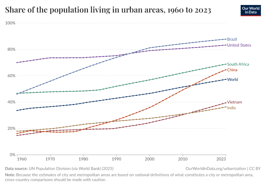 Hannah Ritchie, Veronika Samborska, and Max Roser (2024) - “Urbanization” Published online at OurWorldinData.org. Retrieved from: 'https://drop-explorer-views-index.owid.pages.dev/urbanization' [Online Resource]BibTeX citation