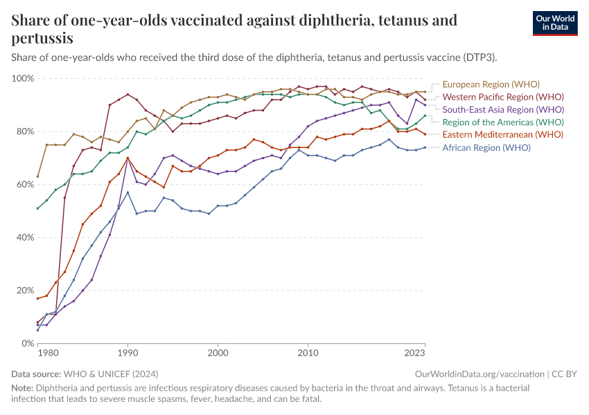 50 years ago, very few children were vaccinated outside of Europe and North America. For example, fewer than 5% of infants received the vaccine against diphtheria, pertussis, and tetanus (DTP3).