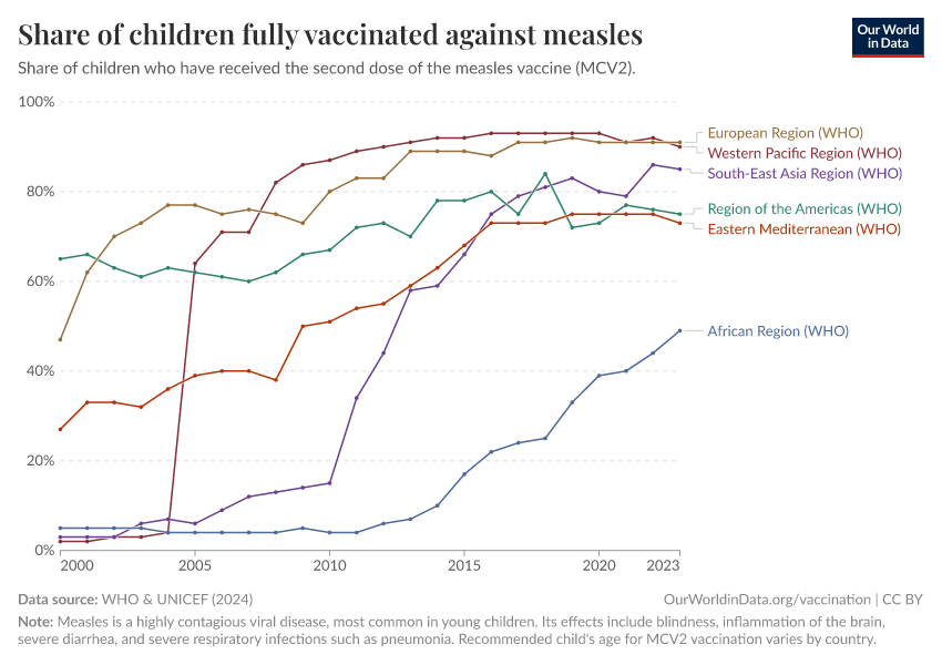As the next chart shows, global vaccination against measles has increased from less than 20% in 2000 to over 70% today. Remember from earlier that vaccination against measles has saved the most lives.